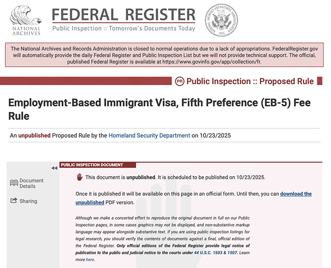 移投界訊:2025年10月23日,美國國土安全部(DHS)與移民局(USCIS)在聯(lián)邦公報發(fā)布了一份EB-5投資移民項目的收費擬議草案(Proposed Fee Rule),并進入為期60天的公眾意見征集期。這份擬議草案是繼《EB-5改革與誠信法案》之后最重要的延伸法規(guī),它將圍繞申請費用、審理速度及投資人權(quán)益保障等核心領(lǐng)域進行多項優(yōu)化調(diào)整,整體方向呈現(xiàn)出明顯利好趨勢。